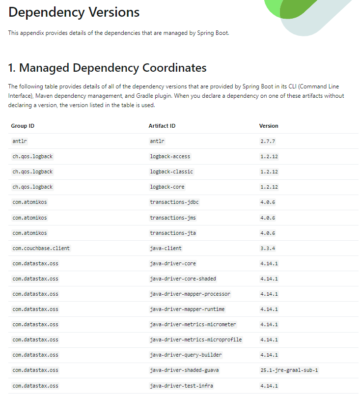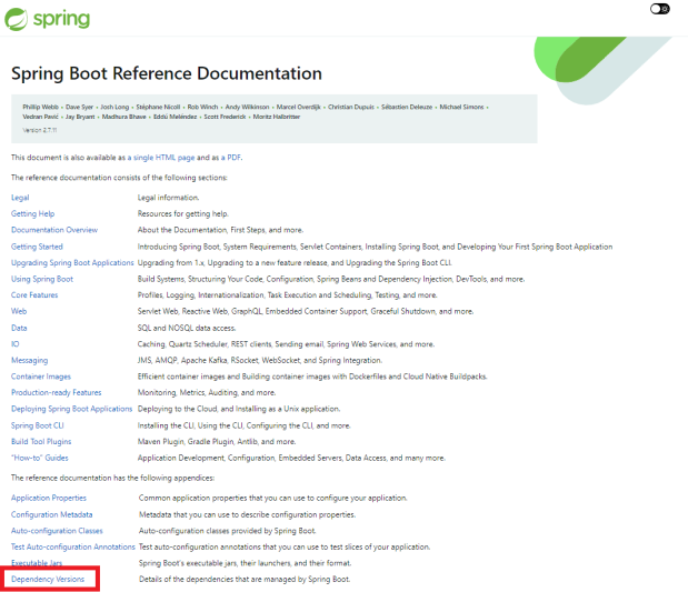 2️⃣Reference Doc화면을 보면 제일 아래 Dependency Versions 항목을 클릭합니다.