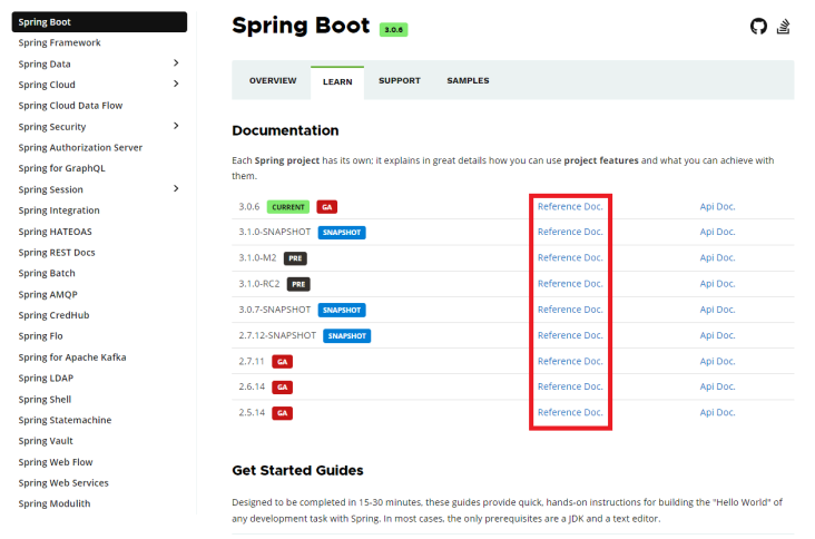 1️⃣사용하고자 하는 스프링 부트 버전의 Reference Doc를 클릭합니다.